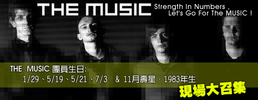 Leeds lads THE MUSIC will come to TAIWAN @ November 16(Sunday) for the first time live show! It's on the back of a brand new album (due for release mid year) called "Strength In Numbers". Their career kicked off with a vengeance.